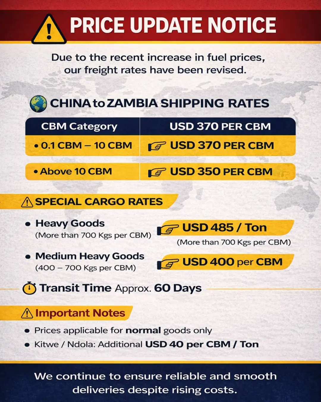 | FREIGHT/CBM | USD 340 PER CBM | USD 320 PER CBM |